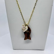 Sterling silver dipped in 18kt gold 22’ length paper clip chain with tiger eye fish charm and pearlized heart charm